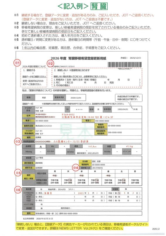 『2026年度腎臓移植希望登録更新用紙』に記載のある感染症の項目や、透析施設情報などに変更がないかご確認をお願いします。変更や追加がある場合は、新たにご記載をお願いします。