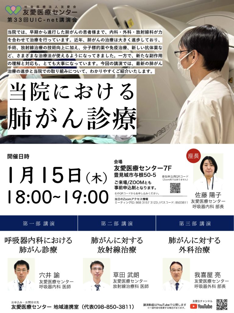 UIC-net講演会とは、がんの疫学、診断、治療に関する友愛医療センター内の最新情報を院内外の関係者に共有し、地域のがん患者の予後やQOLの向上を目指して2021年から開催しているもので、今回で33回目となります。